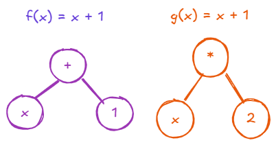 With function composition, the "x" in one function will be replaced by a whole function expression.